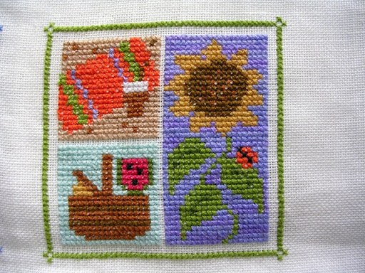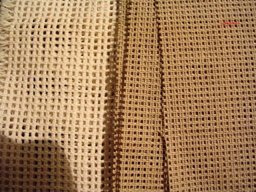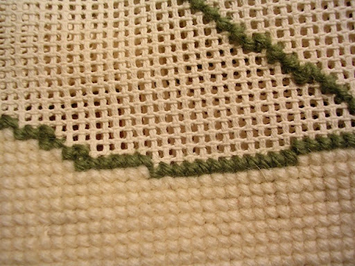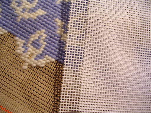 Avevo voglia, quindi, di sfruttare gli schemi pubblicati nei libri, piuttosto che conprare i kits, così ho iniziato la ricerca dei materiali... Mentre la Bradley si è creata le lane in proprio, difficili da trovare sfuse, Beth Russell usa le lane Appleton. C'era, naturalmente, anche il problema del canovaccio, in quanto, almeno nella mia zona, si trovano difficilmente misure diverse dalla Penelope 39. Per chi non fosse pratico, 39 significa che ci sono 39 buchini in 10 cm di tessuto, e la Penelope è un tipo di canovaccio che gli inglesi chiamano interlock, cioè bloccato, per cui i fili della trama e dell'ordito non si muovono. A me occorreva uno a trama più fitta e uno a trama leggermente più rada, in modo da poter ricamare a punto croce anche tappeti. Il vantaggio sta nel fatto che, con il punto croce, il lavoro rimane perfettamente quadrato e non ha bisogno di essere messo su un telaio, cosa particolarmente problematica per lavori molto grandi come un tappeto.